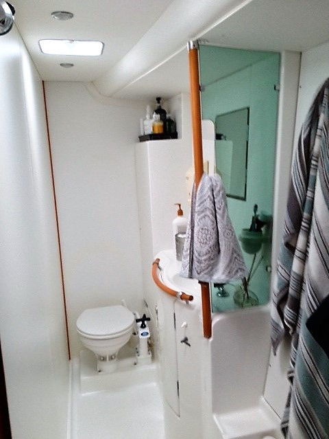 The water tank and generator are located in storage cabinets in the front of the boat. The water tank is about 100 gallons and lasts us for ever, I guess because we’re not using the showers. And the generator allows us to have all of the creature comforts of the dock – heat/AC, hot water heater, all electric not covered by the inverter – while at sea. Yes, that’s right. It’s like having a condo with sails. Mama didn’t raise no fool!