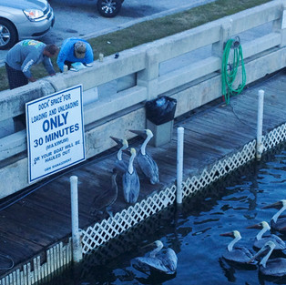 After the fishermen had left, the pelicans raided the trash cans, knocking them over in the attempt to find just a few more scraps. A few got lucky and came out with a belly fully of fish. Like these guys…
