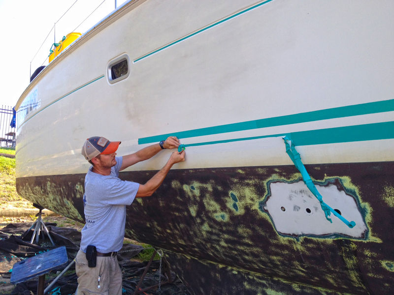 We’ve come a long way in the past three days, but still have SO much more to do. It seems like it takes forever to do just the smallest of projects. Like removing the teal pin striping, which took me a full day to scrape and clean the adhesive. Then there’s the daily runs out to West Marine to pick up additional supplies – it’s always some small stupid part that we didn’t know we needed until we were elbows deep into a project. That’s an hour wasted there. Then there’s the physical exhaustion of long days and hard, sweaty work, that seem to be slowly eating away at our pace and our gumption. We were originally supposed to go back in the water tomorrow, but we’ve decided to push it to Tuesday to give us the weekend to finish up.
