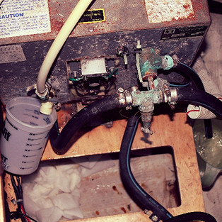 Last Friday turned out to be our lucky day when Matt discovered that our hot water heater was corroded to the point where water was leaking into our engine compartment. In hindsight we probably saw the warning signs about two weeks ago when we turned on the faucet in our port head and noticed the water was a weird brownish color. Matt’s first thought was that it was rust from the hot water heater, but we checked the other faucets and they were running clear. If it was rust, wouldn’t they all run that icky brown color? Luckily we don’t shower on the boat… I would NOT want to be in the middle of rinsing my face with that grossness coming out of the showerhead! <shudder> . After running the water for about a minute or two it cleared up, and since we weren’t having the issue elsewhere, thought it was something in the hose and put changing out the sink hoses on our to-do list. Well, I suppose we should have trusted his instinct, because sure enough that was definitely a death rattle from our beloved hot water heater.