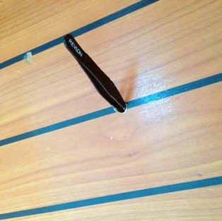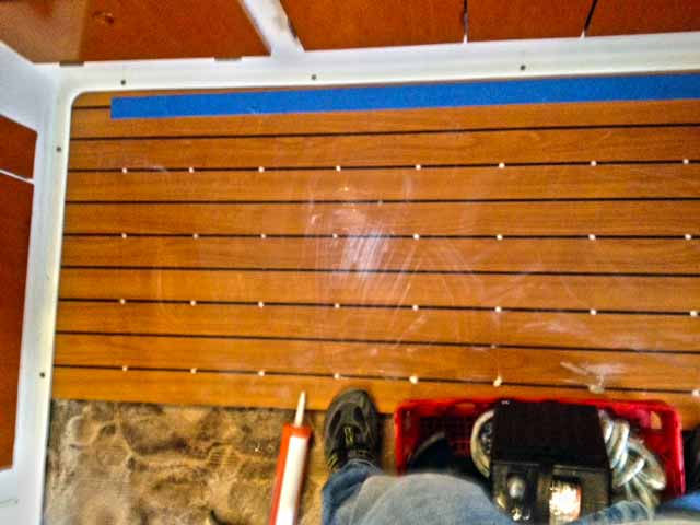 We drilled holes about every 4″ thru the wood floor and just into the fiberglass. One slip of the drill and we would suddenly have additional water views – and not in a good way! To think that there has only been less than two inches of flooring all this time was a little unnerving!